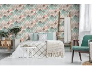 Vliesová tapeta s vinylovým povrchem, jemná textura, vzor netradičního 3D obkladu v odstínech tyrkysové, růžové a béžové. Co u vás zaujme: autentický vzhled, vysoká odolnost a omyvatelnost. Design: nadčasový, eklektický. Úroveň tapetování: pro začátečníky