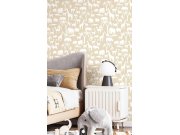 Dětská vliesová tapeta, bílý podklad, béžový ornamentální motiv květin a lesních zvířátek. Tapeta má látkovou texturu, je vhodná do dětského pokojíčku.