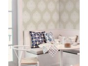 Béžová hladká předklížená tapeta na zeď, ornamentální zámecký damaškový vzor.