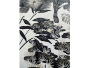 Béžová vliesová tapeta s květinami a listy v odstínech černé, béžové a jemně metalické zlaté. Foto interiéru je pouze ilustrační.