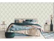 Jemně plastická šedobéžová vliesová tapeta s vinylovým povrchem, motivy květin s nádechem do zelena, látková textura.