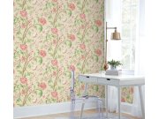 Béžová vliesová tapeta na zeď, jemně plastické květy dřínu v odstínech růžové, bílé, béžové a zelené.