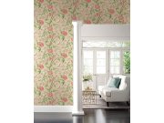 Světle béžová vliesová tapeta na zeď, rozkvetlé větvičky v odstínech korálové, zelené a krémové, motýli a ptáčci.