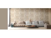Luxusní plastická béžová vliesová tapeta s vinylovým povrchem, motivy větviček a listů v odstínech hnědé, šedo-béžové a zlato-stříbrné; hrubší textura.