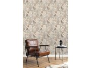 Béžová, jemně strukturovaná vliesová tapeta s vinylovým povrchem, listy v odstínech modré a hnědé. Foto interiéru je pouze ilustrační - odlišné barvy.