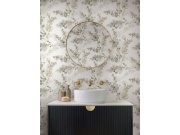 Bílá vliesová tapeta na zeď, motýli, ptáčci a rozkvetlé větvičky v odstínech šedé a béžové, zlaté a stříbrné metalické detaily.