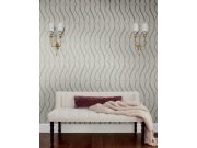 Luxusní béžovo-stříbrná tapeta na zeď s geometrickými ornamenty se zlatavými odlesky. Foto interiéru je pouze ilustrační - odlišné barvy.