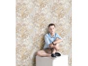 Bílá vliesová tapeta na zeď, motivy listů v odstínech okrové, zelené, tyrkysové a hnědo-červené. Látková textura.