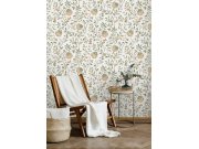 Bílá vliesová tapeta na zeď, motivy květin v odstínech zelené, růžové a okrové.