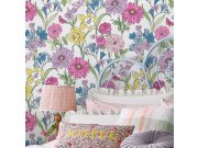 Vliesová tapeta na zeď, bílý podklad, motivy květin a listů v odstínech zelené, modré, růžové a fialové. Co vás zaujme: vyrobeno s ohledem na udržitelnost a ekologii. Design: přírodní. Úroveň tapetování: pro začátečníky. Země původu: Švédsko.