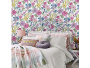 Vliesová tapeta na zeď, bílý podklad, motiv drobnějších květin a mašliček v odstínech zelené, červené, růžové, modré, fialové a žluté. Co vás zaujme: vyrobeno s ohledem na udržitelnost a ekologii. Design: klasický, květinový, vintage. Úroveň tapetování: p