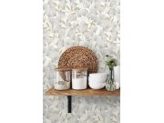Bílá vliesová tapeta s vinylovým povrchem, motivy šedo-stříbrných a béžových listů Ginkga.