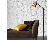 Hladká bílá vliesová tapeta na zeď, rozkvetlé větvičky v odstínech šedo-stříbrné.