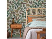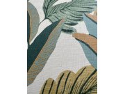 Bílá vliesová tapeta na zeď, motivy listů v odstínech okrové, zelené, tyrkysové a hnědo-červené. Látková textura.