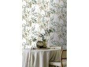 Bílá lesklá vliesová tapeta s vinylovým povrchem, motiv bambusu v odstínech zelené a hnědé.