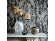 Pololesklá černá vliesová tapeta na zeď, motivy listů kapradin v odstínech šedo-stříbrné.