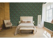 Černá vliesová tapeta na zeď, prolisovaný květinový vzor v odstínech zelené a růžové.