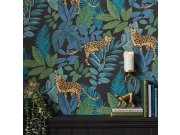 Černá hladká vliesová tapeta s leopardy. Listy jsou v odstínech zelené, modré a tyrkysové.