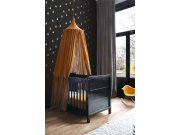 Černá vliesová tapeta se zlatými puntíky.