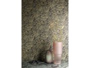 Jemně plastická vliesová tapeta na zeď, černý podklad, zlaté a zelené květiny a listy.