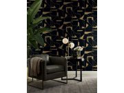 Černá vliesová tapeta na zeď, hladký podklad, plastické zlaté lístečky.