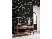Černá vliesová tapeta na zeď, plastické zlaté linie tvoří geometrické vzory.