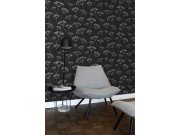 Vliesová tapeta na zeď, motiv rostlin a listů, barvy bílá, černá, šedá, některé listy stříbrné.