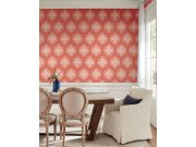 Korálově červená hladká předklížená tapeta na zeď, ornamentální zámecký damaškový vzor.