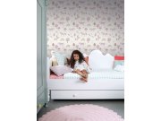 Jemně fialková dětská vliesová tapeta, motivy kytiček a zajíčků. Tapeta má látkovou texturu, je vhodná do dětského pokojíčku pro nejmenší děti.