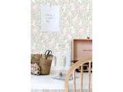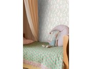 Hladká vliesová tapeta na zeď, květinový vzor v pastelových odstínech zelené, tyrkysové, růžové a béžové.