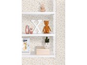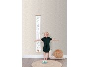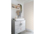 Dětská vliesová tapeta, bílý podklad, béžový ornamentální motiv květin a lesních zvířátek. Tapeta má látkovou texturu, je vhodná do dětského pokojíčku.