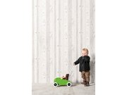 Dětská vliesová tapeta, bílý podklad, béžový ornamentální motiv květin a lesních zvířátek. Tapeta má látkovou texturu, je vhodná do dětského pokojíčku.
