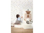 Dětská vliesová tapeta, bílý podklad, béžový ornamentální motiv květin a lesních zvířátek. Tapeta má látkovou texturu, je vhodná do dětského pokojíčku.