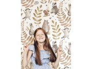 Hravá dětská vliesová tapeta na zeď, zvířátka a listy, bílý podklad, zvířátka v odstínech hnědé a šedé, listy růžové a zlaté. . Co vás zaujme: zdravotně nezávadné materiály vhodné do dětských pokojů. Design: dětský, přírodní. Úroveň tapetování: pro začát