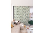 Dětská vliesová tapeta, bílý podklad, béžový ornamentální motiv květin a lesních zvířátek. Tapeta má látkovou texturu, je vhodná do dětského pokojíčku.