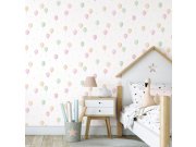Bílá vliesová tapeta na zeď, hvězdičky a balonky v odstínech žluté, růžové a zelené.