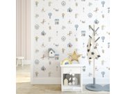 Bílá vliesová tapeta na zeď, hvězdičky a balonky v odstínech šedé, modré, zelené a žluté.