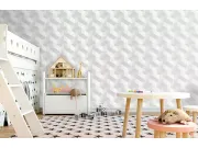 Luxusní vliesová tapeta s vinylovým povrchem, efektní geometrický retro vzor v odstínech bílé, šedé a stříbrné. Foto interiéru je pouze ilustrační - odlišné barvy.