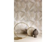 Geometrická tapeta s výrazným vzorem v odstínech béžové a šedé.