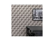 Jemně plastická vliesová tapeta s vinylovým povrchem, 3D geometrický vzor v odstínech šedé, metalický pololesk. Vzorek cca 3,8 cm. Foto interiéru je pouze ilustrační - odlišné barvy. Co vás zaujme: kvalita zpracování, vysoká odolnost. Design: 3D, geometri