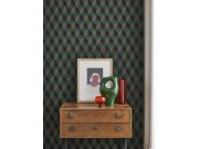 Geometrická vliesová tapeta s 3D efektem, kostky v odstínech zelené, černé a hnědé, látková textura.
