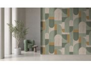 Vliesová tapeta na zeď, geometrické vzory v odstínech zelené, šedé a okrové. z 5 dílů 0,53 x 280cm. Tapeta má navazující vzor, pokud potřebujete pokrýt širší stěnu, stačí přikoupit další kus (sadu 5 pruhů). Jednotlivé pruhy samostatně objednat nelze. Co v