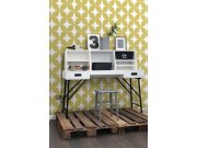 Vliesová, bílá tapeta s hořčicovým geometrickým vzorem.