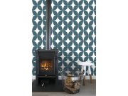 Vliesová, bílá geometrická tapeta s petrolejově modrým geometrickým vzorem.