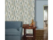 Geometrická tapeta s výrazným vzorem v odstínech béžové, hnědé, šedé a modré.