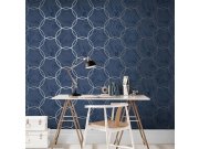 Tmavě modrá hrubě strukturovaná tapeta s metalickými geometrickými ornamenty.