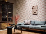 Geometrická vliesová tapeta na zeď, odstíny růžové, béžové, červené, modré - inspirováno dílem Vincenta Van Gogha. Foto interiéru je pouze ilustrační.