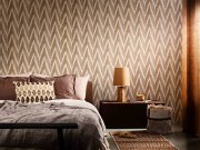 Luxusní plastická vliesová tapeta s vinylovým povrchem, geometrický vzor v odstínech hnědé, béžové, okrové a terakota; hrubší textura. Foto interiéru je pouze ilustrační - odlišné barvy.