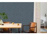 Vliesová tapeta na zeď s šedými a černými geometrickými obrazci na modrém podkladu.