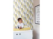 Geometrická vliesová tapeta na zeď, bílé, šedé a okrové trojúhelníky.